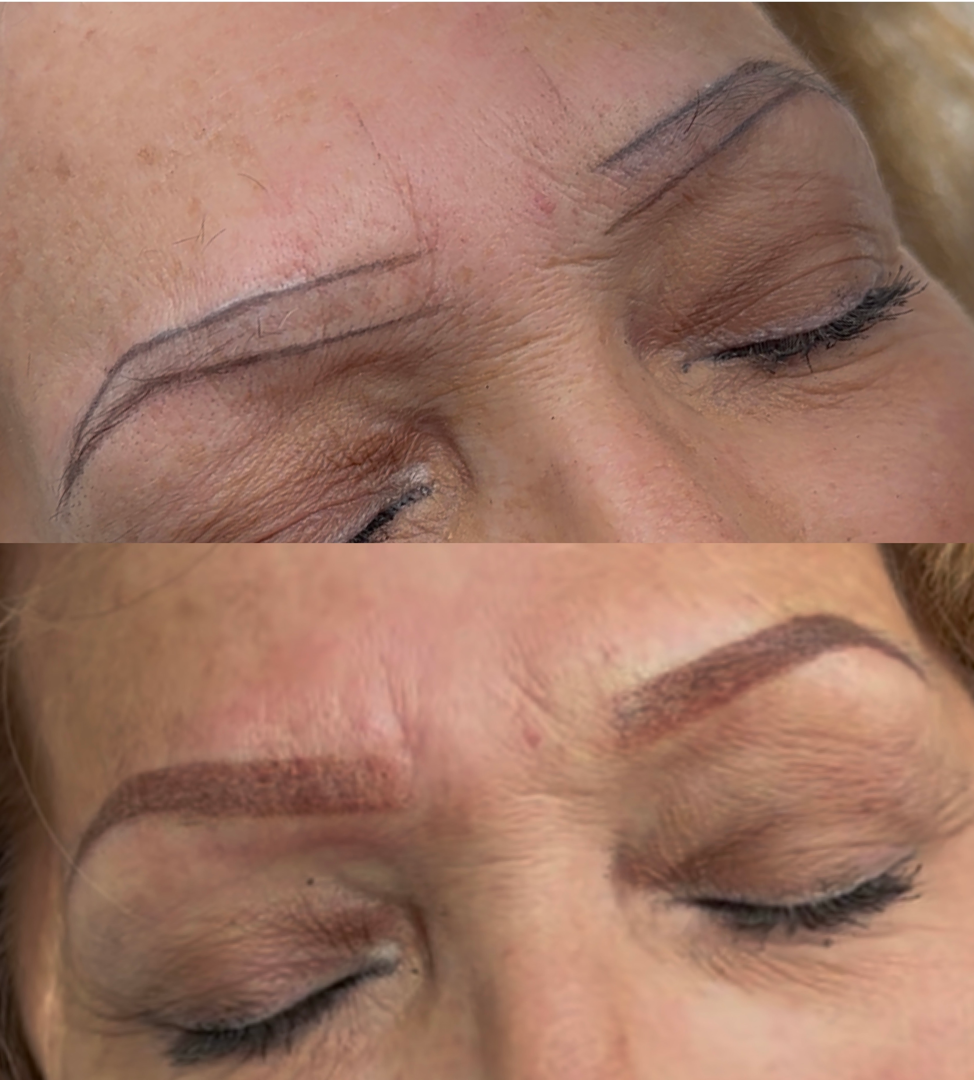 Your natural brows are mapped and shaped to suit your unique facial features. As they heal, the color will soften and settle into a natural ombré gradient, lighter at the front and darker toward the tail. Full healing takes about 4–6 weeks, revealing soft, filled-in brows that enhance your face without needing daily makeup. These last 2-3 years.
